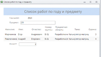 В конце учебного года руководитель готовит отчет по сданным курсовым работам в группе. Так же есть возможность выводить список работ по определённому предмету и году. И работ по руководителям.