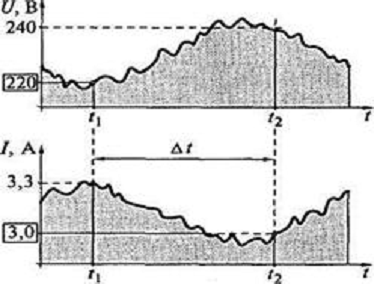 Предположим, что в момент времени t1 измерено действующее значение напряжения U (t1) = 220 В. Затем, скажем через 1 мин, в момент времени t2 этим же прибором измерено действующее значение тока I (t2) = 3,0 А. Далее по результатам этих исходных прямых измерений вычисляется значение активной мощности (нагрузку считаем чисто активной):