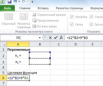 )Создадим область переменных. Ячейки В2:В3 будут играть роль переменных (пока они пусты)