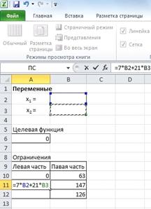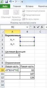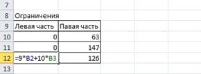 3)Создадим область ограничений. В ячейках А10:А12 будем вычислять левые части ограничений в системе, а в ячейках В10:В12 введем правые части ограничений системы (см. рис.6)