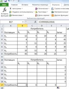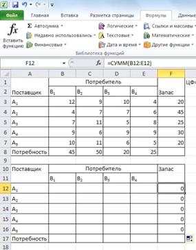 В диапазоне F12:F16 количество груза, которое необходимо вывезти от поставщиков.