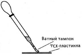 Образец обычно наносят с помощью капилляра в виде 1 - 2%-ного раствора в летучем растворителе типа дихлорметана или эфира (избегайте полярных растворителей, например этанола); раствор удобнее всего готовить в маленьком пузырьке. Капилляр для нанесения капель легко сделать из капилляра для определения температуры плавления; для этого среднюю часть капилляра помещают в пламя горелки, а затем осторожно растягивают и ломают в месте растяжения.