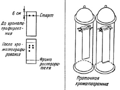Из бумаги определенного сорта вырезают полоску, размер которой соответствует размерам применяемого для хроматографии цилиндра. На расстоянии 3 см от нижнего края карандашом наносят маркировочную линию. На этой линии через 2 - 2,5 см друг от друга и от краев полоски помечают точки старта. Специальной пипеткой наносят каждую точку старта; при этом образуются пятна около 1 см в диаметре. Затем растворителю дают испариться.