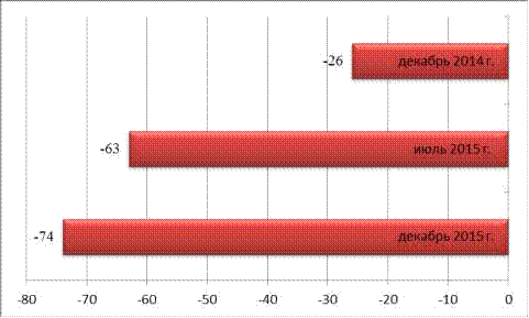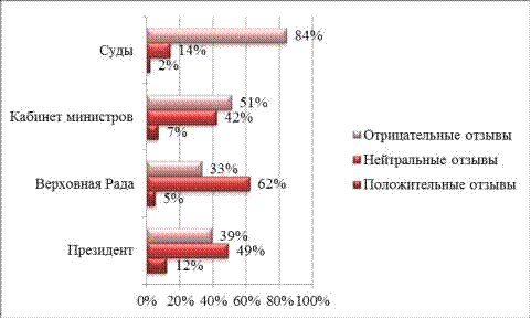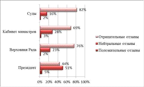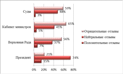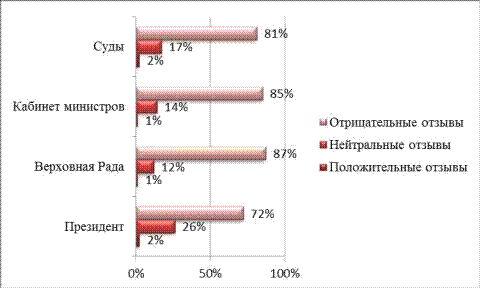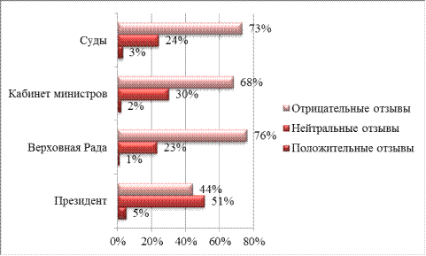 Однако результаты социологических опросов и контент-анализа Интернет ресурсов за 2015 г. показывают, что позитивные изменения в ситуации были весьма кратковременны. В декабре 2015 г. рейтинг доверия к президенту был равен - 40%, антирейтинг Верховной Рады достиг - 72%, для Кабинета министров аналогичный показатель составил - 67%. Уровень доверия граждан к судам, несколько увеличившийся к лету 2015 г. (- 67%), вернулся к показателю - 72 % (см. Приложения № 10 - 13)23. Тренды в развитии динамики провластных настроений, выявленные в ходе социологических опросов, подтверждаются результатами контент-анализа. В частности, доля положительных упоминаний о президенте, Верховной Раде и Кабинете министров сократилась более чем в 2 раза в каждом из случаев. При этом удельная доля отрицательных отзывов существенно увеличилась лишь в случае Верховной Рады - с 33% до 76% - и Кабинета министров - с 51% до 69% (см. Приложение № 15).