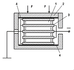 На рис. 3.10 приведена простейшая схема пьезоэлектрического датчика, состоящего из пластинок 1, и станиолевых прокладок 3, которые служат одним из выводов (-), а второй вывод имеет контакт с корпусом 2. Изоляционная прокладка 4 служит для уменьшения утечки зарядов.