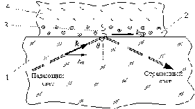 Свет проходит сквозь оптически прозрачную среду 1 с относительно большим показателем преломления, например, сквозь призму из стекла и падает под определенным углом на тонкую металлическую пленку 2, нанесенную на поверхность стекла. Угол падения должен быть больше угла полного внутреннего отражения. Часть света проникает в металл и распространяется в нем в виде быстро затухающей электромагнитной волны 3. Последняя возбуждает колебания свободных электронов металла - т.н. "электронной плазмы". И в этой плазме могут возникать коллективные колебательные движения электронов, которые принято описывать как квазичастицы - т.н. "поверхностные плазмоны".