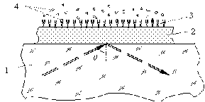 - прозрачная среда с высоким показателем преломления; 2 - тонкая металлическая пленка; 3 - чувствительный слой лиганда; 4 - молекулы (частицы) аналита.