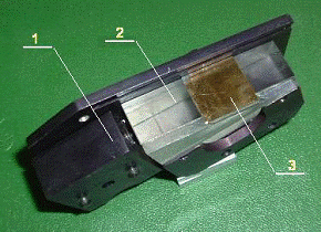 На рисунке 18 показан внешний вид ППР иммуносенсора со стороны грани призмы, на которой установлен "рецепторный" чип 3 с пленкой золота.