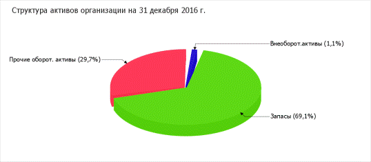 Структура активов организации на 31.12.2016 характеризуется большой долей (98, 9%) текущих активов и незначительным процентом внеоборотных средств. Активы организации за весь период значительно увеличились (на 76%). Отмечая значительный рост активов, необходимо учесть, что собственный капитал увеличился еще в большей степени - в 10, 1 раза. Опережающее увеличение собственного капитала относительно общего изменения активов следует рассматривать как положительный фактор. Следует отметить, что Общество работает в арендуемом помещении.