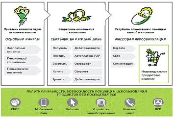 Различные сегменты Банка: пенсионеры, студенты, более состоятельные клиенты, корпоративные клиенты имеют различные финансовые потребности. Это с одной стороны представляет возможности для развития специализированных моделей обслуживания и формирования точечных индивидуальных предложений, с другой стороны позволяет проводить анализ потребностей и корректировать общую продуктовую политику Банка. Также должны развиваться возможности по формированию персонализированных предложений для клиентов, адаптированных именно под их ситуацию и потребности.