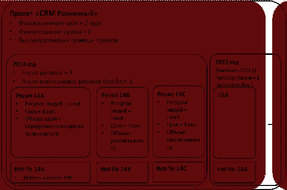 Между бизнес-заказчиками и подразделением, разрабатывающим CRM-систему, была согласована схема релизов, согласно которой в год разрабатывается и выводится в промышленную эксплуатацию 3 релиза. Емкость каждого релиза (количество требований) рассчитывается на основании фиксированного срока (4 месяца), фиксированного числа человеческих ресурсов, которые могут реализовать данные требования (исходя из планируемой оценки трудоемкости требований). Таким образом, из общего списка требований всех бизнес - заказчиков формируются и согласовываются границы каждого релиза, что определяет вектор развития CRM системы.