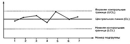 график и контрольная карта. Контрольные карты графически отражают динамику процесса, т.е. изменение показателей во времени. На карте отмечен диапазон неизбежного рассеивания, который лежит в пределах верхней и нижней границ. С помощью этого метода можно оперативно проследить начало дрейфа параметров по какому либо показателю качества в ходе технологического процесса для того чтобы проводить предупредительные меры и не допускать брака готовой продукции.