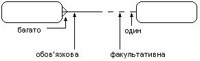 На діаграмах зв'язки представляються лініями, що з'єднують два прямокутники сутностей. Одним з видів зв'язку представлений на наступному рис. Це зв'язок зі ступенем багато-до-одному, обов'язковий в закінченні зі ступенем "багато", і факультативний на протилежному кінці.