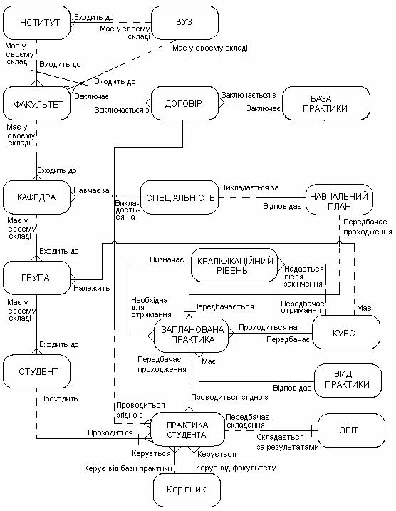 Проведений аналіз предметної області дозволив виділити перелік сутностей, що беруть участь у організації керування проходженням практики на факультеті (у Вузі). Аналіз цих сутностей та їх атрибутів, дозволяє виділити декілька класів типових інформаційно-довідкових задач.