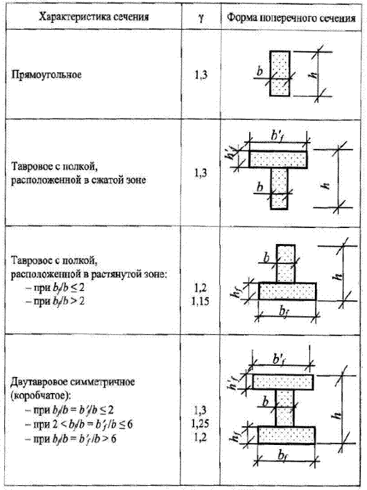 Значение коэффициента γ для определения упругопластического момента сопротивления некоторых сечений