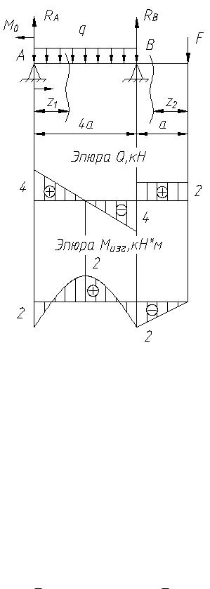 При z1 = 0 Q1 = 2qa = 4кН , Мизг1 = - qa2 = - 2кН × м;