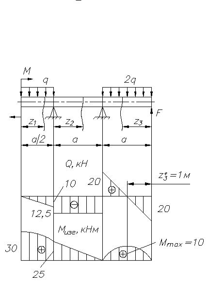 Мизг1 = - M0 + RA z1 - 12 q z12 = - q a2 + 2q a z1 - 12 q z12 .
