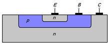 будова біполярного транзистора NPN типу. Колектором служить напівпровідник