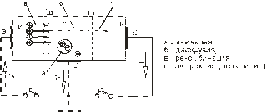 Дія біполярного транзистора базується на використанні двох p-n переходів між базою та емітером і базою та колектором. В області p-n переходів виникають шари просторового заряду, між якими лежить тонка нейтральна база. Якщо між базою й емітером створити напругу в прямому напрямку, то носії заряду інжектуються в базу й дифундують до колектора.
