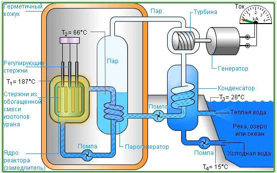 В тепловыделяющих элементах при распаде урана высвобождается огромное количество тепла, они раскаляются и греют теплоноситель вокруг себя. Разогретая в реакторе радиоактивная вода под большим давлением и с температурой в сотни градусов откачивается из атомного реактора наружу и через теплообменник отдает тепло воде второго контура и потом, охлажденная, закачивается обратно в атомный реактор, охлаждая его и опять нагреваясь сама. Вода второго контура кипит, раскаленный пар попадает в турбину и вращает ее, а та в свою очередь вращает электрогенератор. Все это окружено внешней оболочкой (бетон с железным наполнителем), и отражателями нейтронов (рис. 1).