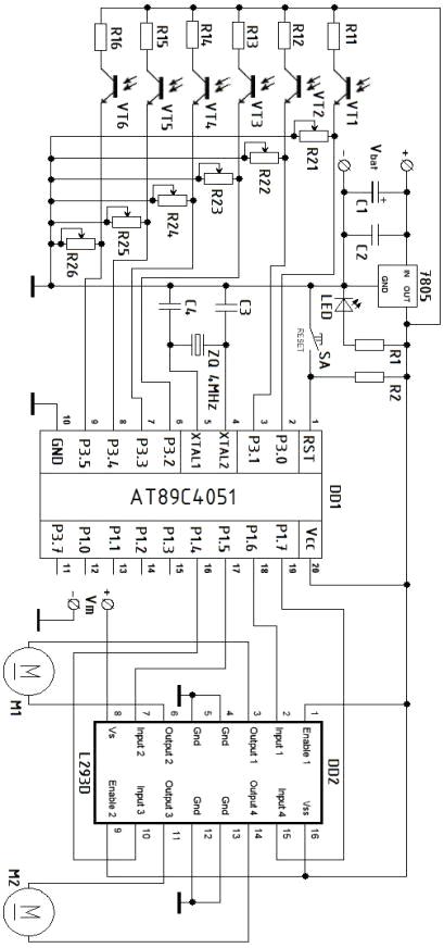 В качестве светодатчиков используются фототранзисторы VT1…VT6, с которых сигналы поступают на микроконтроллер. На фототранзисторы подается напряжение 5V через резисторы R11…R16. Чтобы датчики не реагировали на слишком слабый свет к ним подключаются подстроечные резисторы R21…R26, они позволяют настроить чувствительность датчиков. Номинал этих резисторов настраивается экспериментальным путём в зависимости от того насколько ярким будет источник света, на который реагирует робот, и с какого расстояния робот должен заметить его.