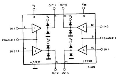 Входы ENABLE1 и ENABLE2 отвечают за включение каждого из драйверов, входящих в состав микросхемы. Входы INPUT1 и INPUT2 управляют двигателем, подключенным к выходам OUTPUT1 и OUTPUT2. Входы INPUT3 и INPUT4 управляют двигателем, подключенным к выходам OUTPUT3 и OUTPUT4. Контакт Vs соединяют с положительным полюсом источника электропитания двигателей, этот контакт отвечает за питание электродвигателей. Контакт Vss соединяют с положительным полюсом источника питания, этот контакт обеспечивает питание самой микросхемы. Четыре контакта GND соединяют с "землей".D содержит сразу два драйвера для управления электродвигателями небольшой мощности. L293D обеспечивает разделение электропитания для микросхемы и для управляемых ею двигателей, что позволяет подключить электродвигатели с большим напряжением питания, чем у микросхемы.