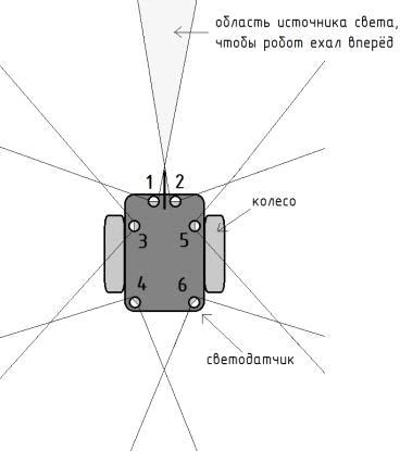 датчики, то робот будет двигаться вперёд, а если света совсем не будет, то