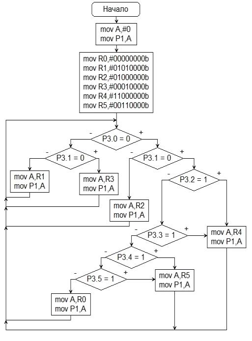 выбирается в зависимости от значения данных с регистра P3 согласно таблице 1. Программа определяет данные с регистра P3 на каждом цикле.