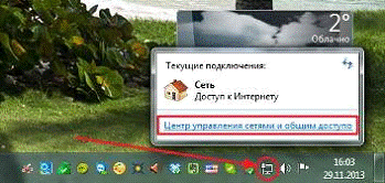 кнопкой мышки на значок Сеть. В открывшемся окошке нажимаем на ссылку Центр
