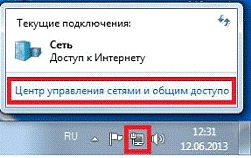 "Центр управления сетями и общим доступом" или нажмите на кнопке