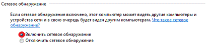 В используемом вами профиле (домашнем, рабочим или общем) проверьте, включено ли Сетевое обнаружение, если выключено - включите. (рис. 16). Сохраните изменения.