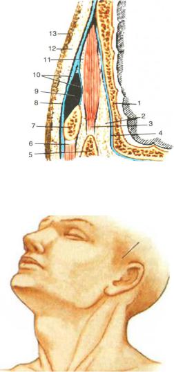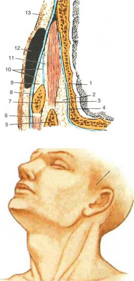 глубокая флегмона; 3 – височная мышца; 4 – надкостница; 5 – венечный отросток нижней челюсти; 6 – жевательная мышца; 7 – скуловая дуга; 8 – поверхностная фасция; 9 – межапоневротическая клетчатка; 10 – собственная фасция; 11 – подапоневротическая клетчатка; 12 – подкожная клетчатка; 13 – кожа.