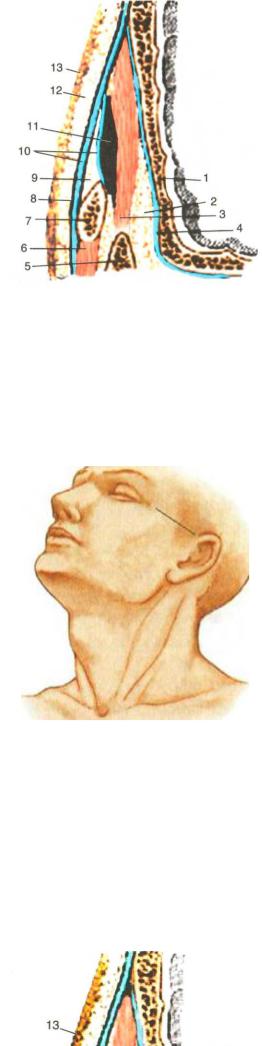 –собственная фасция; 11 – подапоневротическая клетчатка; 12 – подкожная клетчатка; 13 – кожа.