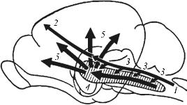 1, 2 – специфический проводящий путь; 3 – коллатерали, отходящие от специфического пути к ретикулярной формации ствола мозга; 4 – восходящая активирующая система ретикулярной формации; 5 – генерализованное влияние ретикулярной формации на кору больших полушарий