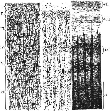 I – молекулярная пластинка; II – наружная зернистая пластинка; III – наружная пирамидальная пластинка; IV – внутренняя зернистая пластинка; V – внутренняя пирамидальная пластинка; VI – мультиморфная пластинка; VII – волокна молекулярной пластинки; VIII – волокна наружной зернистой пластинки; IX – волокна внутренней зернистой пластинки; X – волокна внутренней пирамидальной пластинки