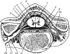 1 – мягкая мозговая оболочка; 2 – подпаутинное пространство; 3 – паутинная оболочка; 4 – субдуральное пространство; 5 – твердая мозговая оболочка; 6 – желтая связка; 7 – спинной мозг; 8 – задний корешок; 9 – передний корешок; 10 – спинномозговой узел; 11 – тело позвонка; 12 – соединительная ветвь к симпатическому узлу; 13 – задняя ветвь спинномозгового нерва; 14 – передняя ветвь спинномозгового нерва