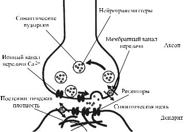 Ширина синаптической щели варьирует от 20–30 до 50 нм. Любой химический синапс, независимо от природы медиатора и хеморецептора, активируется под влиянием потенциала действия, распространяющегося к пресинапсу от тела нейрона. Под влиянием потенциала действия происходит деполяризация пресинаптической мембраны, что повышает проницаемость кальциевых каналов пресинаптической мембраны и приводит к увеличению входа в пресинапс ионов Са2+. В ответ на это происходит высвобождение из пресинапса 100–200 порций (квантов) медиатора, что осуществляется путем экзоцитоза. Выйдя в синаптическую щель, медиатор взаимодействует со специфическими рецепторами постсинаптической мембраны. Активированные медиатором рецепторы непосредственно регулируют проницаемость ионных каналов постсинаптической мембраны. Взаимодействие медиатора с постсинаптическими рецепторами изменяет ионную проницаемость. В синапсах, в которых осуществляется возбуждение постсинаптической структуры, обычно происходит повышение проницаемости для ионов Na+ или Са2+, что вызывает деполяризацию постсинаптической мембраны. Эта деполяризация получила название возбуждающего постсинаптического потенциала (ВПСП). Если его величина достигает критического уровня деполяризации, то во внесинаптических областях генерируется ПД. В тормозных синапсах в результате взаимодействия медиатора с рецепторами, наоборот, происходит гиперполяризация (за счет, например, увеличения проницаемости для ионов K+ и Сl–). Этот вид изменения мембранного потенциала получил название тормозного постсинаптического потенциала (ТПСП). В гиперполяризованном состоянии клетка снижает свою возбудимость и благодаря этому прекращает отвечать на внешние раздражители или