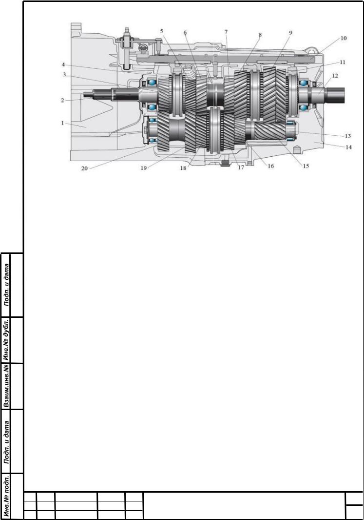 1 – картер механизма сцепления; 2 –вал первичный; 3 – ведущая шестерня; 4 – муфта синхронизатора; 5 –шестерня V передачи; 6 –шестерня III передачи; 7 –шестерня IV; 8 –шестерня II передачи; 9 –шестерня I передачи; 10 – шток с вилкой для переключения передач; 11 –шестерня передачи заднего хода; 12 – вторичный вал; 13 – промежуточный вал; 14 – задний отсек КПП; 15 – шестерня I передачи и передачи заднего хода; 16 –шестерня II передачи; 17 –ше- стерня IV передачи; 18 –шестерня III передачи; 19 –шестерняV передачи; 20 – шестерня постоянной передачи.