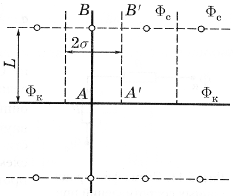 Решение задачи находится с помощью метода суперпозиции. Цепочка скважин стоков отображается зеркально относительно контура питания в скважины-источники, и рассматривается интерференция двух цепочек скважин в неограниченном пласте. Вдоль прямой АВ, проходящей через скважину-сток и скважину-источник, частицы движутся наиболее быстро, а вдоль прямых А'В', делящих расстояние между скважинами пополам, движение будет наиболее медленным, так как линии, в силу симметрии потока, представляют собой непроницаемые границы.