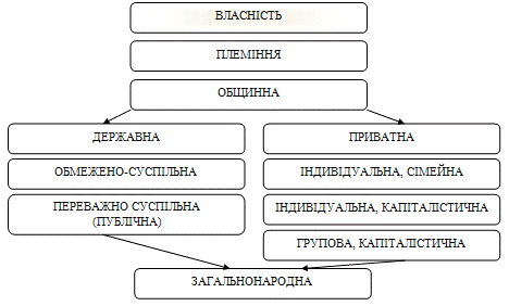 Історичний процес розвитку відносин власності відображається поняттями "тип", "вид" та "форма" власності.
