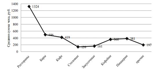 Данные свидетельствуют о том, что такие предприятия, как ресторан, проводят достаточно высокую ценовую политику; в закусочных и столовых она более демократична. Ценовая политика в специализированных предприятиях общественного питания, таких как кофейни и пиццерии, в 2,5-3 раза выше, чем в столовых и закусочных. При этом данные заведения предлагают ограниченный ассортимент по сравнению с кафе, ресторанами и барами, но условия комфорта выше, чем в столовых и закусочных, имеющих минимальный средний чек по городу