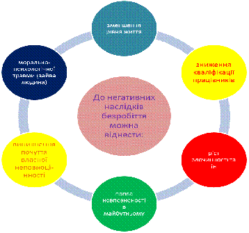 Загроза безробіття в умовах України пов'язана не з кризою надвиробництва, вичерпанням місткості ринку, як у західному світі, а з сучасною кризою недовиробництва, неузгодженістю процесів вивільнення, перерозподілу та працевлаштування робітників, тобто з глибокими деформаціями, що мали місце в попередній економічній системі та наступною економічною політикою.