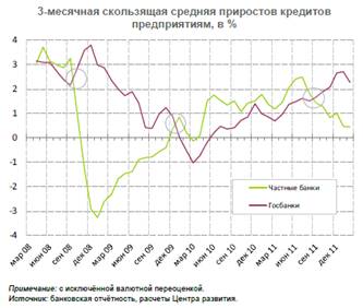 В 2011 году банковские активы практически не росли или даже падали в связи с тем, что банки в начале года приостановили кредитование как корпоративных клиентов, там и предприятий малого и среднего бизнеса. Банки активно занимались реструктуризацией задолженности и работой с проблемной задолженностью, взысканием просроченной задолженности. В этот период и сами предприятия и организации снизили объемы заимствований, пытались реструктуризировать кредитные портфели. В связи с повышением ставок заимствования, некоторые предприятия и организации приняли решения сократить свои кредитные портфели, для того, чтобы снизить затраты. Только в конце 2011 года, учитывая наличие избыточной ликвидности, а также снижение учетной ставки ЦБ, банки стали возвращаться на рынок кредитования корпоративных клиентов и предприятий малого и среднего бизнеса.