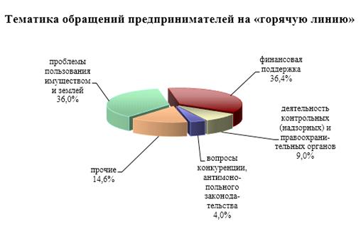 По поручению Губернатора области работает «горячая линия» по проблемам предпринимательства, на которую в 2012 году поступило 157 обращений. С какими вопросами предприниматели обращаются на «горячую линию» показано на рисунке 3[24].