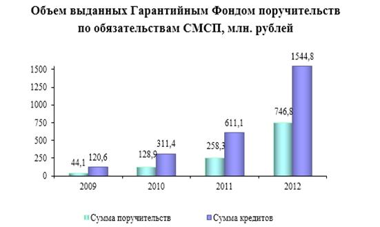 На 01.01.2013 г. выдано 573 поручительства, общий объем полученных кредитов составил 2,6 млрд. рублей. За время работы Фонда объем ежегодно выдаваемых поручительств по обязательствам СМСП перед коммерческими банками вырос почти в 17 раз, сумма кредитов - в 13 раз. Объём выданных Гарантийным Фондом поручительств с момента его работы показан на рисунке 4[24].