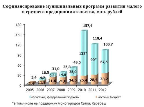 В 2012 году профинансирована 31 муниципальная программа на 67,5 млн. рублей, в том числе около 34 млн. рублей - программы поддержки предпринимательства 11 моногородов.
