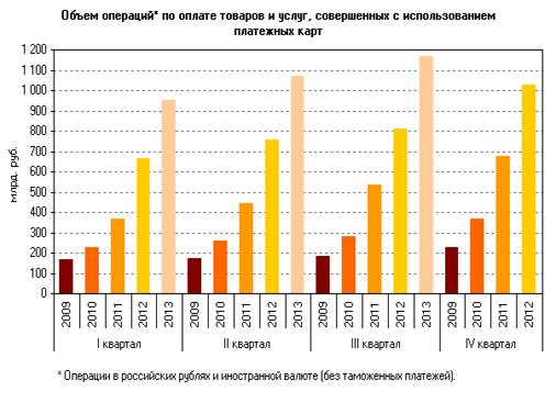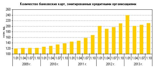 По итогам 2009 года, количество банковских карт в обращении достигло 121605 тыс. штук. В 2010 г. Показатели увеличились на 16 млн. штук и, в 2011 г. выросли еще на 30 млн., в 2012 году количество карт в обращении достигло 209 млн. 369 тыс. штук. В 2013 году рост продолжился и показатели составили 210 млн. 831 тыс. штук. [Приложение 2]