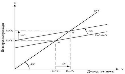 Мультипликатор государственных расходов равен мультипликатору инвестиций, так как они оказывают на экономику идентичный эффект. Действительно, рост государственных закупок (как и инвестиций) создает дополнительный спрос на товары и услуги, который вызывает первичное приращение дохода, равное росту государственных расходов. Часть этого дохода, определенная предельной склонностью к потреблению, будет использована на потребление, что приведет к дальнейшему возрастанию совокупного спроса и национального дохода и т.д.