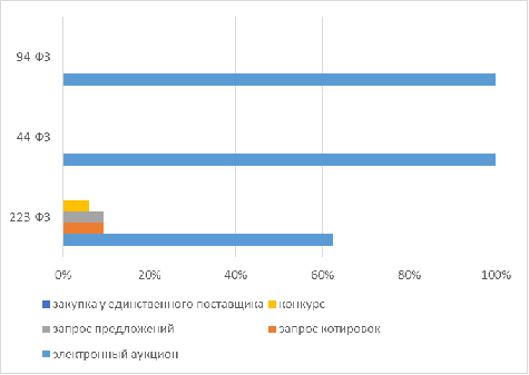 Как видно из диаграммы, субъекты Закона № 223-ФЗ используют разнообразные способы закупки, а государственный заказ (44-ФЗ, 94-ФЗ) отличается однородностью, в нем используется только электронный аукцион, что связано с требованиями закупки автобусов путем проведения электронного аукциона [7]. Важно отметить, что в ходе исследования в рамках Закона 223-ФЗ были выявлены различающиеся названия закупочных процедур, так как законодательно не закреплён единый конечный список возможных способов закупок, и каждый заказчик сам прописывает их в Положение о закупках. В связи со свободой заказчиков в части описания способов определения поставщика возникает трудность сопоставления закупок, так как используются различные формулировки процедур, имеющих схожий смысл (запрос котировок, запрос цен, запрос предложений) или наоборот под одинаковым названием заказчики подразумевают различные правила со своими нюансами. Во всех закупочных процедурах, использующих аукцион, он проводился исключительно в электронной форме, несмотря на то, что для субъектов Закона 223-ФЗ в отличие от 44-ФЗ не является обязательным требованием.