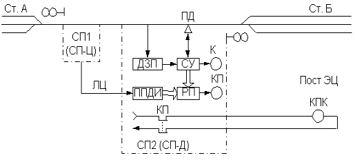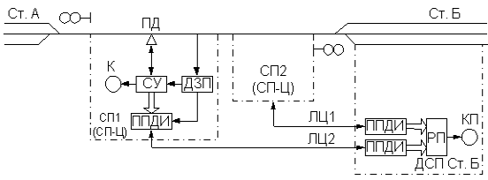 Аппаратура каждого СП состоит из путевого датчика ПД, счетного устройства СУ, приемопередатчика дискретной информации (ППДИ) и датчика занятости пути ДЗП (рельсовая цепь в зоне установки ПД).
